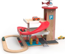 Všetkým automobilovým nadšencom sa rozžiaria oči, až uvidia farebnú garáž s výťahom a heliportom. Natankujte ekologicky pri stojane na prízemí. Vyvezte svoje vozidlo pomocou výťahu s kľukovým pohonom a sledujte, ako sviští po rampe dole a pokračuje ďalej po dráhe. Stala sa nehoda? Z heliportu na streche už štartuje helikoptéra. Táto edukatívna hračka motivuje deti ku kreatívnej a predstavivej hre. Rozvíja koordináciu ruka-oko, jemnú motoriku a zručnosť. Garáž s parkovacími plochami na troch úrovniach obsahuje aj 4 autíčka a helikoptéru.