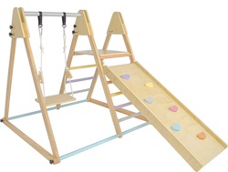 Vzhľadom k dizajnu a zvolenej farebnosti - prírodného dreva kombinovaného s tlmenými, pastelovými odtieňmi - sa stáva skvelým doplnkom do každej izbičky! Multifunkčnosť tejto hracej zostavy ponúka širokú škálu aktivít ako preliezanie, hojdanie, kĺzanie alebo lezenie. Vďaka týmto činnostiam deti rozvíja motorické zručnosti, rovnováhu či koordináciu pohybu. Výrobok je tvorený z hojdačky, rebriny a dosky s pastelovými úchytmi. Vyžaduje sa montáž dospelej osoby. Dodáva sa v demonte a s detailným návodom na zostavenie (CZ, SK, EN).