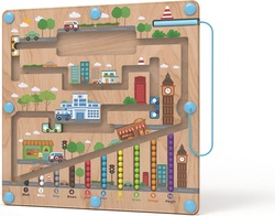 Dokážete potom navrátiť guličky späť na svoje miesto podľa farby? Zábavná drevená hra, ktorá pomáha deťom rozvíjať jemnú motoriku, orientovať sa v priestore a rozširovať slovnú zásobu pomenovávaním farieb a predmetov v meste. Deti sa tiež učia základy počtov formou hry. Drevená základňa v dizajne mesta je krytá odolnou priehľadnou plastovou doskou, hračka je vďaka tomu bezpečná.