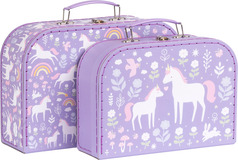 Súprava dvoch kartónových kufríkov s motívom jednorožcov. Kufríky sú ideálne na ukladanie predmetov a hračiek. Poslúži aj na uloženie výtvarných potrieb. Súprava obsahuje 2 rôzne veľké kufríky vyrobené z odolného kartónu s polyesterovým prešívaním. Oba sú vybavené kovovým madlom a sponou na zaistenie kufra.