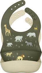 Súprava dvoch silikónových podbradníkov, jeden s motívom zvierat zo savany a jeden v doplnkovej jednofarebnej verzii. Podbradníky sú vodeodolné, ľahko sa čistia a majú záchytné predné vrecko. Podbradníky majú nastaviteľnú veľkosť a možno ich ľahko zrolovať a uložiť. Silikónové podbradníky sú navrhnuté tak, aby deti boli pri jedle v pohodlí a čistote.