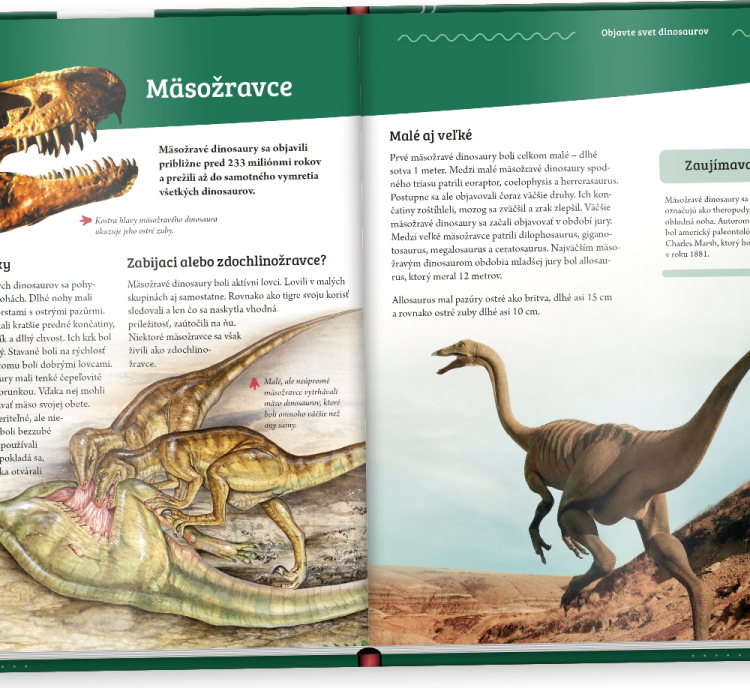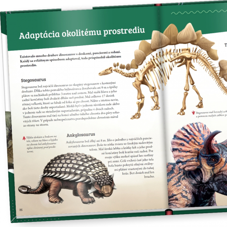 Evolúcia v priebehu času | Počiatky dinosaurov | Dvaja svojho druhu | Mäsožravce | Strašné mäsožravce | Ostatné mäsožravce | Bylinožravce | Brachiosaurus | Obrovské bylinožravce | Zbrane a brnenia | Adaptácia okolitému prostrediu | Tvrdohlavé dinosaury | O zuboch a zobákoch | Pozri, viem lietať! | Prečo dinosaury vyhynuli? | Od kosti ku kameňu | Lovci fosílií | Dinosaury okolo nás | Rozšírenie po celom svete | Register | Slovník pojmov