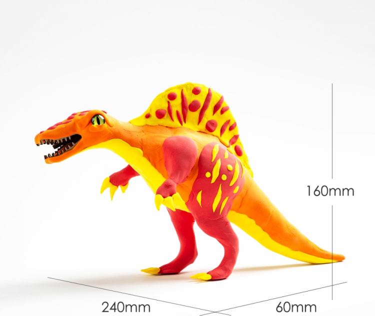 V balení sa nachádza aj materiál na výrobu modelu Spinosaura. Najskôr postavte podľa návodu drevenú kostru dinosaura a potom pomocou pribalenej plastelíny vymodelujte telo.