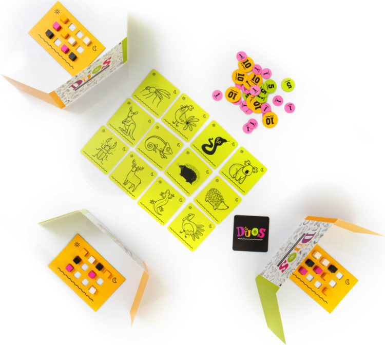 Duos - Zvířata a Věci je rodinná hra, v ktorej vyberáte páry, ktoré sa k sebe hodia. Každé kolo musíte zvoliť štyri páry z dvanástich náhodne vyložených kariet a môžete len dúfať, že vyberiete tie isté ako rozprávač. Znie to jednoducho? Uvidíte, ako vám to pôjde!