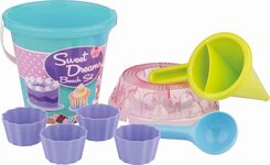 8dielna sada na piesok, vyrobená z kvalitných plastov v Taliansku.Obsahuje: vedierko, priehľadné sitko v tvare torty, lopatku, 4 formičky v tvare bábovky a jeden dekoratérsky lievik na miešanie piesku a vody a vytváranie kreatívnych muffinov a iných výtvorov.