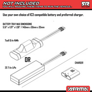 Pre bežné jazdenie a pre deti odporúčame dokúpiť NiMH akumulátor 8.4V (vysoký). Pre lepšiu akceleráciu a dlhšiu dobu jazdy odporúčame 2S LiPo akumulátor s konektorom IC3 alebo EC3.
