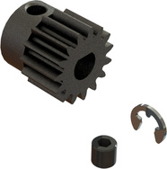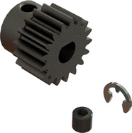 Tuningový diel pre RC modely áut Arrma 3S 4WD Bigrock, Granite, Senton, Typhon: pastorok 18T 0.8M Safe-D5. Otvor pre hriadeľ s plôškou v tvare D zaistí pevné spojenie aj keď sa uvoľní pastorok.
