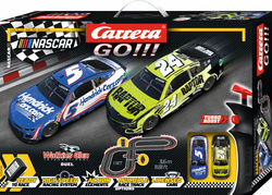 Autodráha Carrera GO!!! dlhá 3,6 m s autíčkami NASCAR Camaro, obsahuje, križovatku, rovinky, zákruty, počítadlo kôl a ďalšie diely. Môžeš si postaviť ďalšie rôzne trate podľa svojej fantázie.