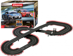 Autodráha Carrera Digital 124 dlhá 9,3m s autami Audi R8 LMS GT3 a BMW M4 GT3 obsahuje rovinky, zatáčky, diely na predbiehanie na rovinke, dvojité premostenie, krajnice, bezdrôtové ovládače a ďalšie diely.