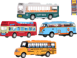Balenie obsahuje štyri kovové modely rôznych autobusov na spätný chod.