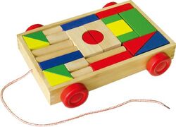 Drevený vozík plný farebných kociek. Vďaka pevnej šnúrke ho za sebou deti môžu ťahať.