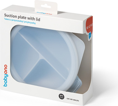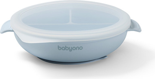 BABYONO Tanier silikónový s prísavkou a viečkom modrý 6m+