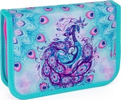 Set s motívom páva pre malé školáčky od 1. do 3. triedy. Školský batoh je navrhnutý s ohľadom na drobné postavy školáčok. Napriek tomu je batoh priestranný, vo vnútri sú dve komory. Hlavná komora pojme veľké dosky a učebnice, vďaka kompresnej kapse s elastickými pásmi zostanú ťažké pomôcky blízko chrbta. Správnemu držaniu tela pomáhajú tiež ergonomicky tvarovaný chrbát a bedrový pás. Batoh s pastelovými farbami stojí na plastových nožičkách a je opatrený reflexnými prvkami.