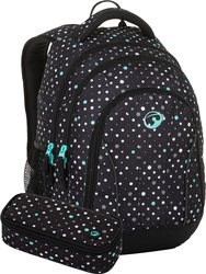 Zoznámte sa so Supernova, čiernym, bielym a tyrkysovým batohom. Má anatomicky tvarovaný chrbát a mäkké ramenné popruhy. Váži len 0,7 kg. Školáčka môže zbaliť knihy a dobrú desiatu. Všetko sa zmestí do troch priestranných priehradiek vrátane polstrovaného vrecka na notebook a dvoch bočných sieťovaných vreciek. Samozrejmosťou sú reflexné prvky a pomôcky na lepšiu organizáciu. Batoh bude verným pomocníkom vašej školáčky od 4. triedy až po základnú školu.