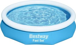 Bestway nadzemný kruhový bazén Fast Set je skvelý rodinný bazén, ktorý zostavíte v priebehu niekoľkých minút. Stačí rovná plocha, nafúknuť vrchný kruh. Telo bazéna sa zdvihne, akonáhle bazén naplníte vodou.