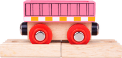Prevezte tovar do cieľa! Tento ružový vagón obsahuje magnetické spojky, vďaka ktorým sa môže pripojiť k iným vagónom alebo lokomotívam z radu Bigjigs Rail.