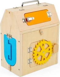 Rôzne zámky a labyrinty. Tento kufríkový domček prináša množstvo zábavy, vďaka ktorej bude môcť Vaše dieťa rozvíjať svoju zručnosť, zvedavosť a najmä jemnú motoriku. Učia deti logickému mysleniu a vytrvaniu vo výzvach. Funguje aj ako praktický úložný box. Spĺňa všetky aktuálne európske bezpečnostné normy. Farbené netoxickými farbami a lakmi.
