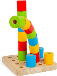 Sada obsahuje 16 pestrofarebných valčekov s štipcami vo vnútri, ktoré je možné naskladať na drevený podstavec a vytvoriť tak rôzne vysoké kývajúce sa veže. Táto hra pomáha rozvíjať u detí obratnosť, priestorové uvažovanie, koordináciu ruka-oko. Deti sa naučia vyrovnávať jednotlivé dieliky a pracovať s rovnováhou, a vďaka hravému kývaniu sa každý pokus o skladanie stane zábavným zážitkom z učenia. Táto stohovacia hračka je určená pre malé deti od jedného roka a je inšpirovaná radom Montessori hračiek.