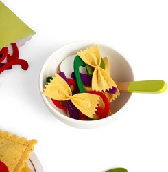 Sada obsahuje drevenú misku a tanier, dve vidličky, strúhadlo na syr s plátkom parmezánu, mäkké plstené ingrediencie ako tagliatelle, ravioli či farfalle, obsahuje aj rôzne farebné druhy zeleniny, paradajkovú omáčku, huby alebo lístky bazalky. Súčasťou sady je aj karta s talianskym menu pre autentický zážitok z reštaurácie.