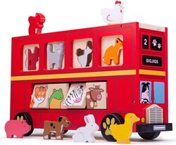 Veľký poschodový triediaci autobus. Prízemie je opatrené z jednej strany posuvnými az druhej strany otočnými oknami s rôznymi zvieratkami. Okná vrchného poschodia potom presnými otvormi pre priložené drevené zvieratká. Zadná časť vrchného poschodia má otváracie dvierka.