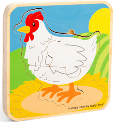 Drevené puzzle, ktoré deťom ukáže životný cyklus sliepky od vajíčka až do dospelosti.