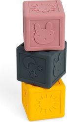 Hmatanie, hryzenie, skladanie a padanie! Tieto senzorické kocky sú vyrobené z hladkého silikónu, v balení nájdete tri, z ktorých má každá iné vzory, napr. králiček, slnko, mesiac, hviezdy ...