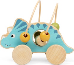 Vydajte sa na cestu do praveku! Usmievavý triceratops v pastelových farbách v kombinácii s prírodným drevom má 4 robustné kolieska a padne deťom presne do ruky Malí dobrodruhovia sa môžu so svojim novým kamarátom hrať vonku alebo vo vnútri, tlačiť ho, jazdiť s ním, posielať si. ho medzi sebou alebo sa zabaviť preťahovaním 7 farebných korálikov na labyrinte s dvojitou slučkou, ktorý je súčasťou hračky. Hračka rozvíja jemnú a hrubú motoriku a koordináciu pohybov a inšpiruje detskú kreativitu a predstavivosť.