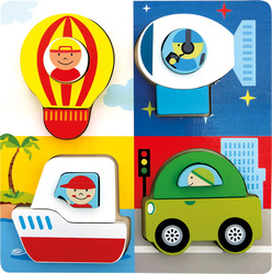 Prvé farebné puzzle pre našich najmenších. Deti môžu skladať jednotlivé časti dopravných prostriedkov. Vďaka robustným dreveným dielikom sa puzzle ľahko uchopujú a používajú.