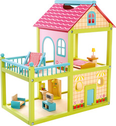 Snáď každé dievčatko túži po kúzelnom domčeku pre svoje bábiky. Teraz ich môže ubytovať v nádhernom domčeku s terasou, odkiaľ môžu sledovať okolie alebo sa opaľovať v pohodlnom ležadle. Veľký drevený domček v pestrých veselých farbách má dve poschodia a je vybavený nábytkom. Jeho obyvateľky môžu sledovať televíziu, umyť sa v kúpeľni a po náročnom dni nabrať sily v pohodlnej posteli. V domčeku bude milovaným bábikám ako v raji a vaše dievčatko sa s ním úžasne vyhrá.