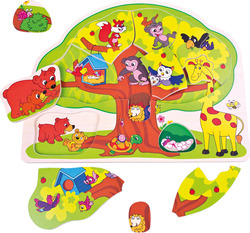 Drevené puzzle "Strom s divokými zvieratami", 12 dielikov, vyrobené z preglejky v tvare stromu, na ktorom sú divé zvieratká. Pri skladaní puzzle sú trénované jemné motorické schopnosti aj logika. Deti sa zoznámia s rôznymi divokými zvieratami.