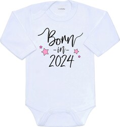 Originálne bavlnené dojčenské body s dlhým rukávom New Baby s nápisom Born in 2024. Farby použité k potlači sú certifikované a vhodné pre bábätká. Je vyrobené z príjemného a kvalitného materiálu, v ktorom sa bude Vaše bábätko cítiť príjemne. Body má zapínanie na cvočky na ramienku a medzi nožičkami, čo uľahčuje obliekanie a prebaľovanie. Doprajte Vášmu bábätku vyniknúť v originálnom body.