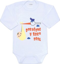 Originálne bavlnené dojčenské body s dlhým rukávom New Baby, s vtipným nápisom DORUČENÉ V ROKU 2024.