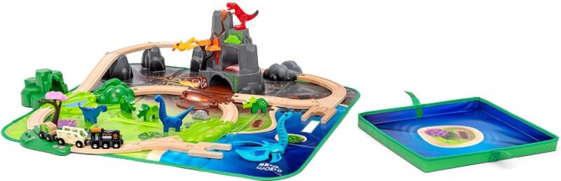 8 x figúrky dinosaurov, 1 x sopka s funkciou erupcie, 1 x lávová jaskyňa, 1 x trávnatá jaskyňa, 1 x dinosaurí vlak s vagónmi, 4 x dieliky krajinnej železnice, 3 x železničné podpery, 18 drevených koľajníc/prehadzovačiek a ďalšie železničné príslušenstvo.