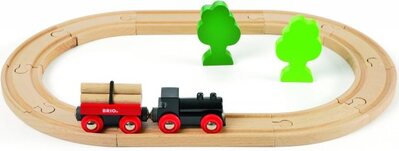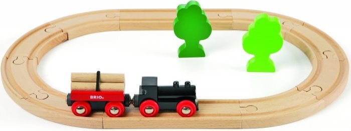 Brio Malá Vláčikodráha s vláčikom a vagónikmi s polenami.Malá drevená Vláčikodráha s mašinou a vagónikmi s polenami poteší každému malého mašinistu. Polená môžete odviezť na pílu na spracovanie, aby si mašinka na chvíľu oddýchla. Súčasťou setu sú tiež dva stromy.