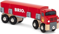 Magnet na zadnej strane prívesu umožňuje pripojenie k akémukoľvek vozidlu BRIO World. Pod červeným krytom prívesu nájdete tri bezpečne uložené drevené polená.