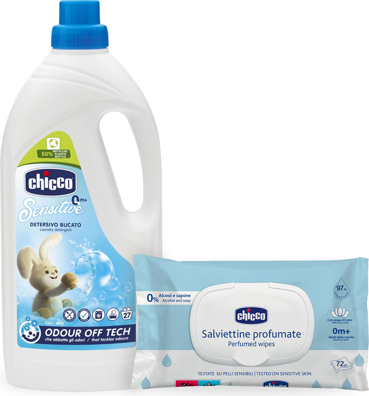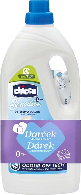 CHICCO Prostriedok prací detský Sensitive 1,5 l (27 praní) + vlhčené obrúsky 72 ks zadarmo