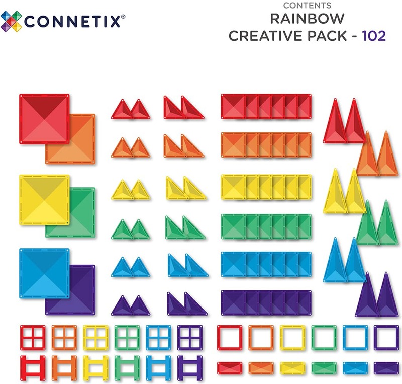 So širokou škálou dielikov v rôznych farbách, vrátane plotov a rámov dverí, je CONNETIX Kreatívny balíček RAINBOW so 102 dielikmi perfektnou štartovacou voľbou pre rodinnú hru a stavbu väčších kreácií CONNETIX!