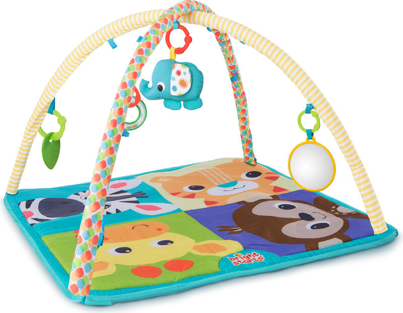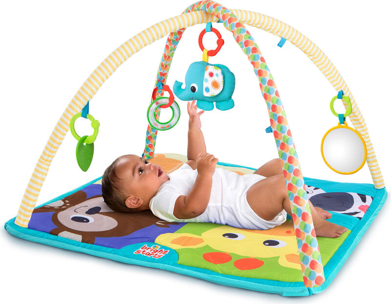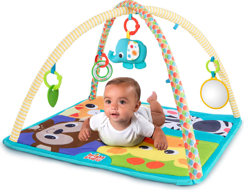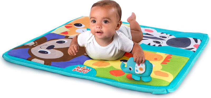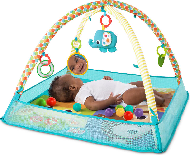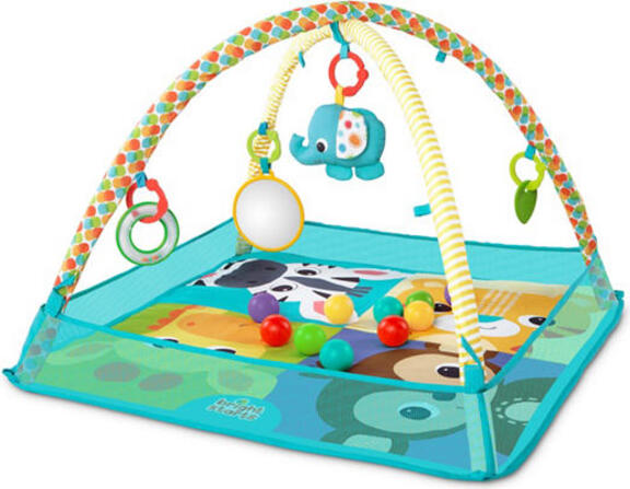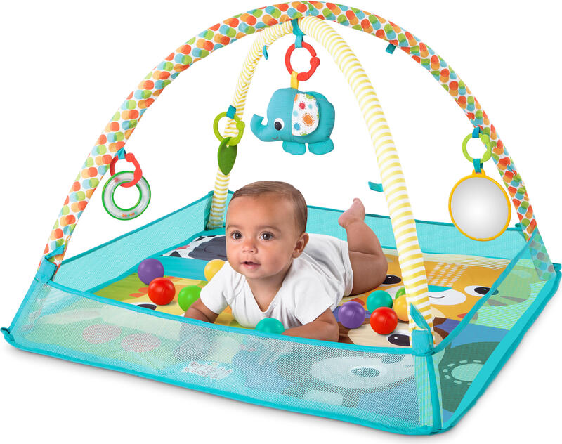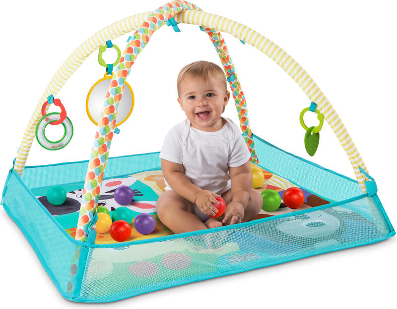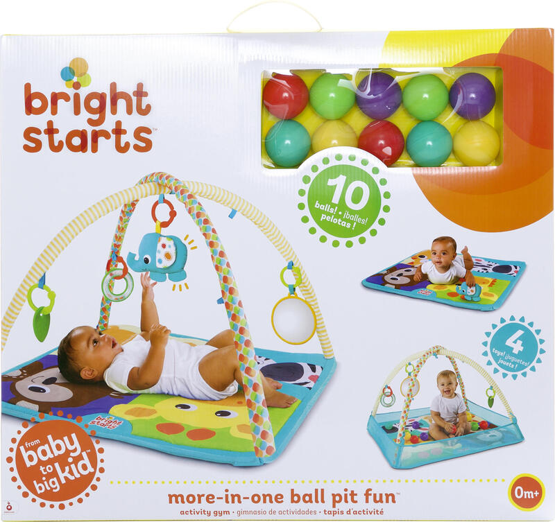Zábava je na prvom mieste! Toto nieje len obyčajná priemerná deka! Viacúčelová hracia deka Ball Pit Fun od Bright Starts, ktorá rastie s dieťatkom je všetko, čo vaše dieťatko potrebuje! 76 centimetrová hracia deka poskytuje útulný povrch pre hranie na zemi, steny tejto sviežej, zábavnej a farebnej deky sa dajú nastaviť hore alebo dole, steny pôsobia ako bariéra počas hry aj hry na brušku a pomáhajú udržať 10 farebných loptičiek vždy poruke a nadosah pre dieťatko. Hrazdička obsahuje 4 odnímateľné hračky, ktoré pomáhajú trénovať motorické schopnosti dieťatka. Hračky zahŕňajú plyšového slona s rolničkou pre sluchovú stimuláciu, krúžok naplnený farebnými guličkami, bezpečnostné zrkadlo pre sebaobjavovanie a hryzačku v tvare listu. Detské hračky sú kompatibilné s inými produktmi značky Bright Start, ktoré majú k dispozícii C-krúžok. A ak sa náhodou stane nejaká drobná nehoda, jednoducho odpojte hrazdičku a steny a podložku môžete oprať v pračke. Od bábätka až po batoľa, bude mať dieťatko loptičky!