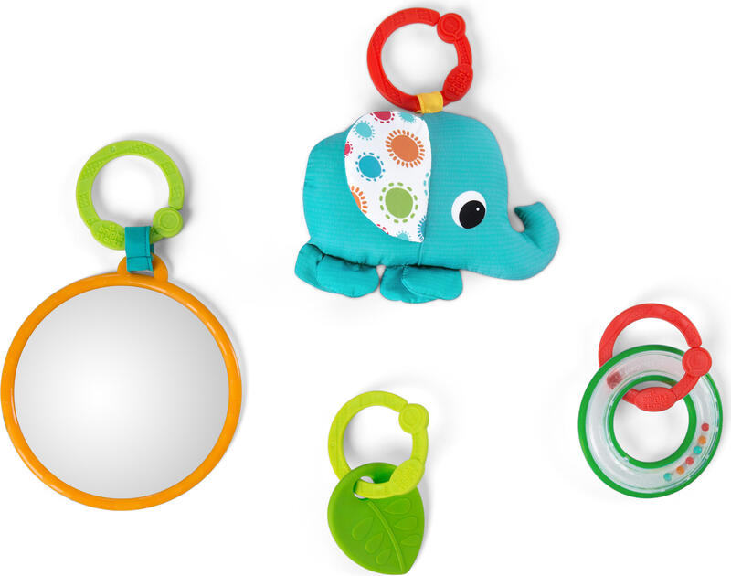 - 4 odnímateľné hračky - plyšový slon s rolničkou pre sluchovú stimuláciu, krúžok naplnený farebnými guličkami, bezpečnostné zrkadlo pre sebaobjavovanie a hryzačku v tvare listu