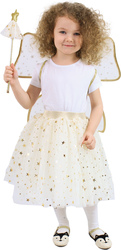 Krásna vília sada pre malé dievčatká! Sada obsahuje tylovú TUTU sukienku s potlačou zlatých hviezdičiek a zlatou gumou v páse, k tomu perfektne zladené krídla a prútik v rovnakom motíve.