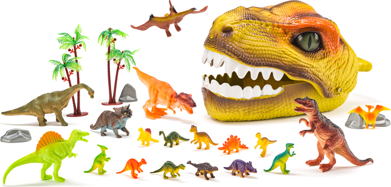 Dinosauria hlava slúži ako praktický úložný box – pojme všetky figúrky aj doplnky a vďaka pohodlnému madlu ju deti môžu ľahko prenášať kamkoľvek. Po stlačení tlačidla pod ňufákom sa papuľa otvorí a hra sa môže začať! Vďaka click systému je možné papuľu nastaviť do viacerých uhlov pre ešte väčšiu zábavu.