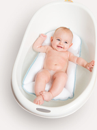 Dieťa leží čiastočne vo vode a rodičia majú úplne voľné ruky na jeho umývanie.