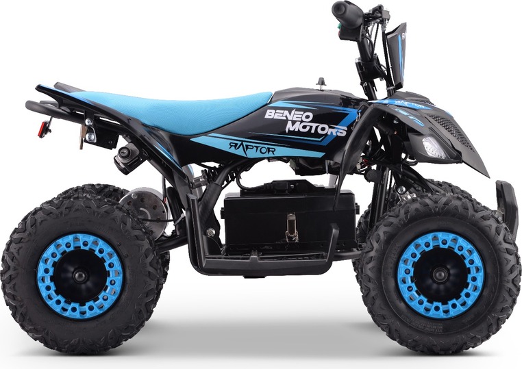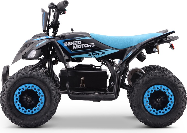 Beneo Motors Quad Raptor 800W Veková hranica: od 3 rokov 36V batéria Predstavujeme Beneo Motors Raptor – ideálnu štvorkolku pre deti od 3 do 6 rokov so všetkými bezpečnostnými prvkami: 3-polohový obmedzovač rýchlosti (5-15-25 km/h), kotúčové brzdy a bezpečnostný kryt reťaze.