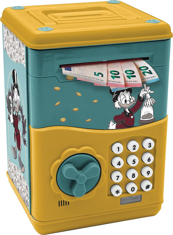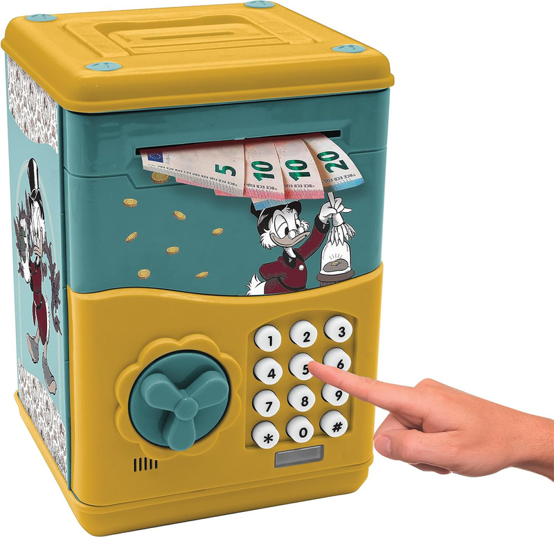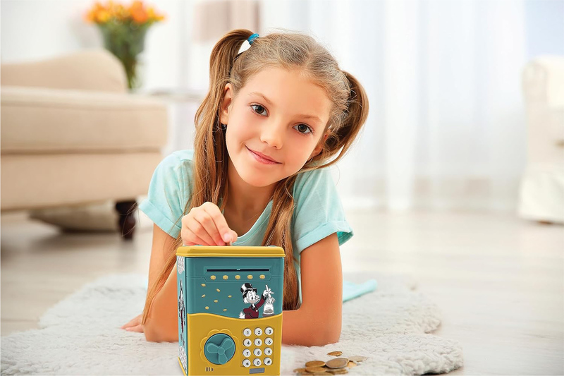 S otvorom pre mince na vrchnej strane a otvorom pre bankovky na prednej strane je vkladanie peňazí jednoduché. Pokladnička pri vkladaní prehráva hudbu a deti si navyše môžu vytvoriť a personalizovať svoj tajný kód ako pri skutočnom trezore!