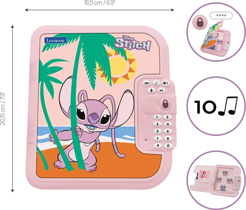 Dodáva sa v peknom ružovom dizajne vo farbách Angel, s oficiálnou licenciou od Disney, a je vybavený zámkom v tvare srdca s dvoma kľúčmi pre extra nádych tajomstva. Perfektný spoločník pre všetkých začínajúcich mladých spisovateľov, ktorí radi vyjadrujú svoje pocity v úplnom súkromí. Zaručene sa do tohto originálneho, kreatívneho a upokojujúceho diára zamilujete!