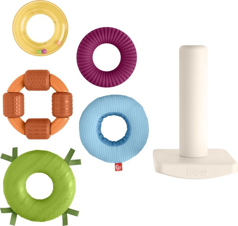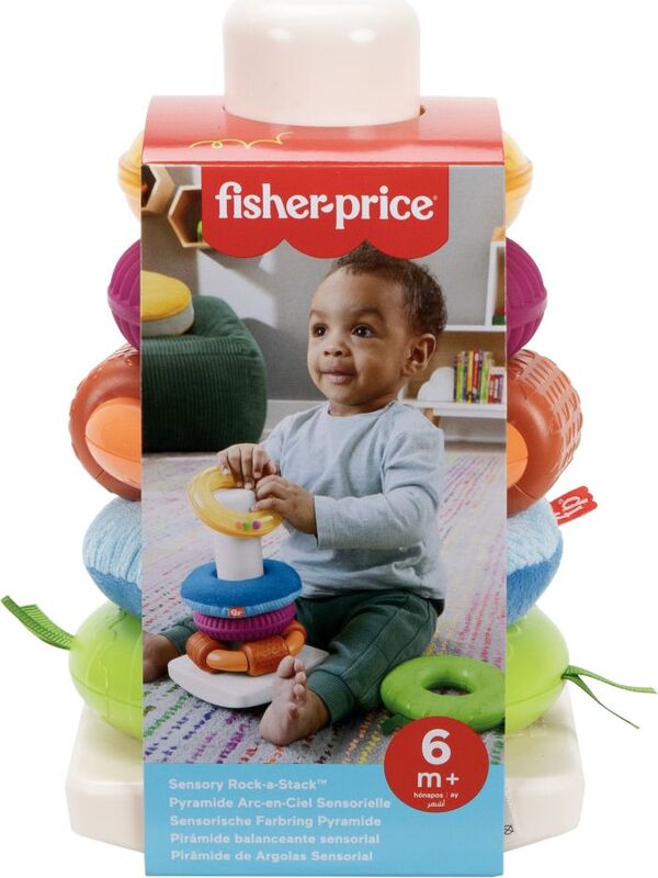 Senzorická skladacia pyramída Fisher-Price je moderná verzia klasickej hračky s kolísavou základňou a piatimi krúžkami rôznych veľkostí. Každý krúžok ponúka iný hmatový zážitok – od mäkkých materiálov cez výrazné štruktúry až po koráliky, ktoré hrkajú.