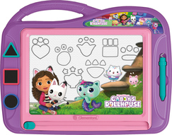 Clementoni Gabby's Dollhouse - Magnetická kresliaca tabuľka s perom a pečiatkami.S touto nekonečnou kresliacou tabuľkou môžu deti kresliť čokoľvek od mačiek a tort až po autá, čísla a písmená. Magnetická kresliaca tabuľa má dizajn Gabby's Dollhouse a je vybavená páčkou, ktorá ľahko maže čiary, keď je tabuľa plná, takže deti môžu znova a znova začínať s novými kresleniami. Dodáva sa s tromi pečiatkami na vytváranie tvarov a rôznych vzorov. Perfektná hra, ktorá podnecuje fantáziu a kreativitu malých umelcov.