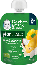 GERBER Organic ovocná kapsička mango a dula s kokosovým mliekom predstavuje jedinečnú desiatu plnú najkvalitnejšieho ovocia. Kapsička obsahuje pyré zo zrelých kúskov manga a dulí, čo jej dodáva prirodzene sladkú chuť. V kombinácii s jemným kokosovým mliekom ovocná desiata pohladí jazýček malého jedáka. Vďaka 100% rastlinným zložkám si túto lahodnú desiatu môžu vychutnať aj jedáci citliví na laktózu. Kapsička je určená pre deti od ukončeného 6. mesiaca.