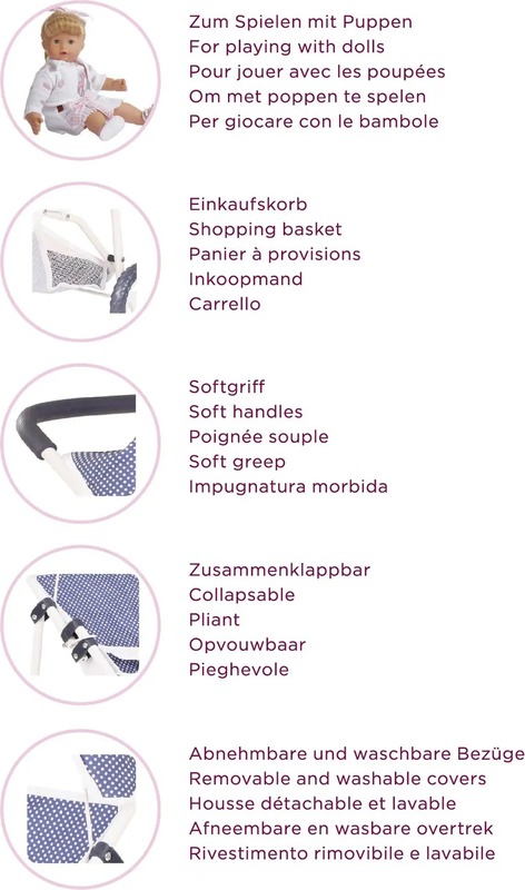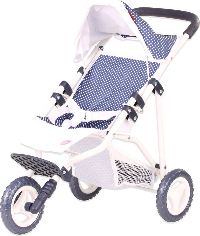 Tento štýlový kočík pre bábiky s veselými bodkami je náš najmenší model z ponuky športových kočíkov. Má slnečnú striešku a mäkkú rukoväť, vďaka čomu sa pohodlne tlačí. Nájdete tu aj sieťovaný nákupný košík, ktorý umožní mamičkám a oteckom bábik ľahko si uložiť všetky svoje veci. Jednoducho vložte svoju bábiku do kočíka a môžete vyraziť.
