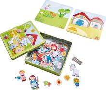 Magnetiská skladačka s motývom zvieratká na farme obsahuje 4 obrázky z prostredia farmy, farmárska rodina, hospodárske zvieratá, rastliny a mnoho ďalších doplnkov.